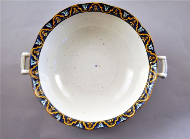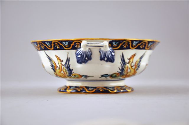 PORTE ÉPONGE godronné sur pied en faïence, de forme ronde et à petites anses rectangulaire, à décors de trophées, de chimères et de personnages masqués sur fond blanc dans le goût de la Renaissance italienne (Urbino). Frise de palmettes stylisées sur fond bleu nuit.
