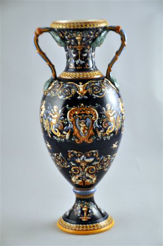 VASE AMPHORE SUR PIÉDOUCHE en faïence à anses feuillagées. Décor d'un amour victorieux dans un médaillon couronné agrémenté de dauphins, amours, rinceaux, trophées et oiseaux sur fond bleu dans le goût de la Renaissance italienne (Faenza). Décor à Candélieri sur le piédouche et sur le col.