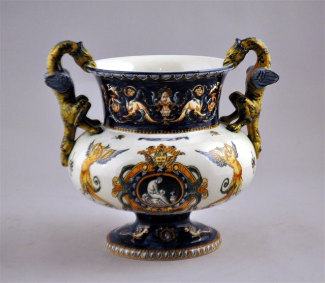 VASE MÉDICIS "AUX CHIMÈRES" en faïence, à ventre sur pied central, anses en forme de chimère. Le décor dans le goût de la Renaissance italienne d'un cartouche couronné à fond noir sur un fond ivoire parsemé de chimères, amours, papillons et déesse de la moisson. Le col et le socle ornés d'une frise d'animaux fantastique sur fond bleu nuit.