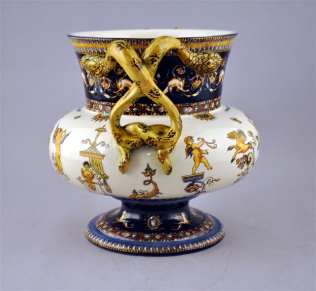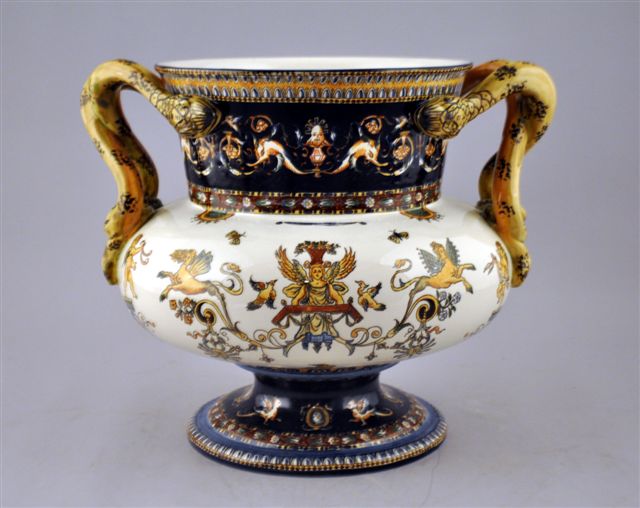 VASE MÉDICIS "AUX SERPENTS" en faïence, à ventre sur pied, les anses en forme de couples de serpent. Le décor dans le goût de la Renaissance Italienne d'un cartouche couronné à fond noir sur un fond ivoire parsemé de chimères, amours, papillons et déesse de la moisson. Le col et le socle ornés d'une frise d'animaux fantastique sur fond bleu nuit.