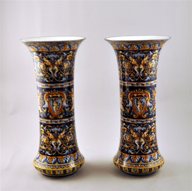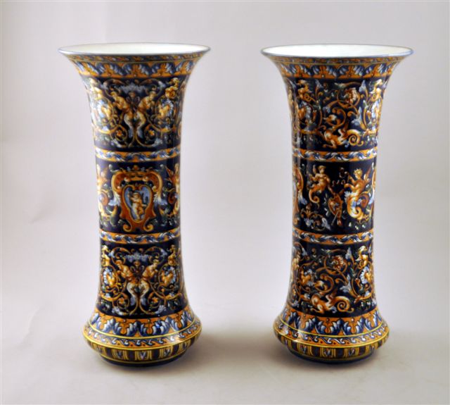 PAIRE DE VASES CORNETS à pied boule en faïence, à décor d'amour victorieux dans un médaillon couronné encadré sur trois niveaux de chimères, animaux merveilleux, satyres et entrelacs sur fond bleu dans le goût de la Renaissance Italienne (Faenza), (restauration au col d'un des vases).