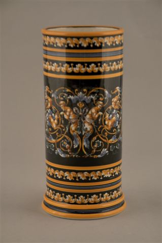 VASE ROULEAU en faïence, à décor de grotesque sur fond noir dans le goût de la Renaissance Italienne.
