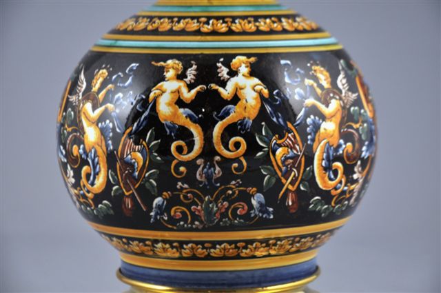 LAMPE À HUILE BOULE À COL en faïence, à décor d'un amour à l'écusson couronné dans un entourage de grotesques, entrelacs, rinceaux et chimères sur fond brun dans le goût de la Renaissance italienne. Belle polychromie où dominent les ocres, les jaunes orangés, les bruns, un bleu ainsi qu'un liseré vert d'eau à décor italien sur rare fond chocolat. Monture de bronze doré.