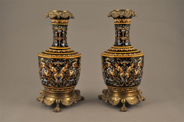 PAIRE DE LAMPES À HUILE BALLUSTRES "D" en faïence montée pour l'électricité, à décor d'un amour triomphant à l'écu couronné dans un entourage de chimères, personnages grotesques, amours et trophées sur fond noir dans le goût de la Renaissance italienne. Monture tripode en bronze doré à griffes de lion et draperies.