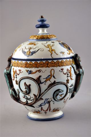 POT COUVERT "AUX SALAMANDRES" en faïence, sur la panse duquel s'enroulent deux salamandres en relief de couleur vert d'eau. Décor polychrome de médaillon couronné et animaux fantastiques sur fond blanc dans le goût de la Renaissance italienne (quatre éclats au couvercle, pied restauré).