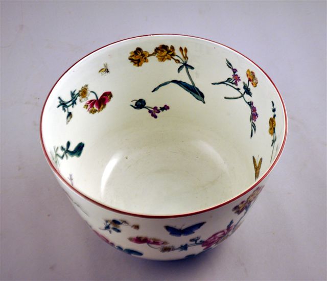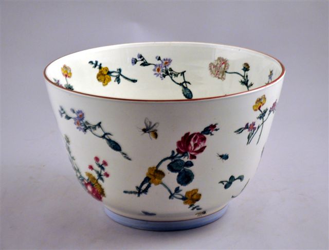 VASQUE "BOL DE RIZ" en faïence, à décor champêtre en décalcomanie sous émail, avec des boutons de roses, branches de rosiers, roses, pivoines et pensées, des papillons et des abeilles dans le goût de Marseille,.
