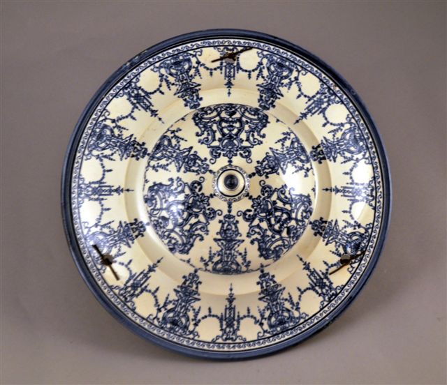 LAMPE DE SANCTUAIRE ronde en faïence, à trois chaînes, terminée par une pomme de pin, de forme aplatie et évasée. Décor en camaïeu de bleu sur fond blanc "à la Bérain" dans le goût de Moustier.