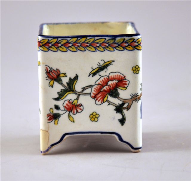 POT À LA CORNE D'ABONDANCE en faïence de forme carrée reposant sur quatre petits pieds, à décor en impression de bleu rehaussé de couleurs d'une corne d'abondance dans le goût de Rouen. Frise de blé et liseré bleu.