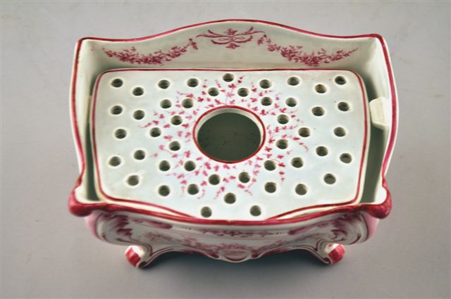 COMMODE PIQUE-FLEURS ROCAILLE en faïence, à décor en camaïeu de pourpre d'un portrait dans un médaillon, d'instruments de musique et de peignés feuillagés soulignant les lignes du meuble dans le goût de Saxe (dans l'état: cheveu, restauration ; pique-fleurs rapporté?).