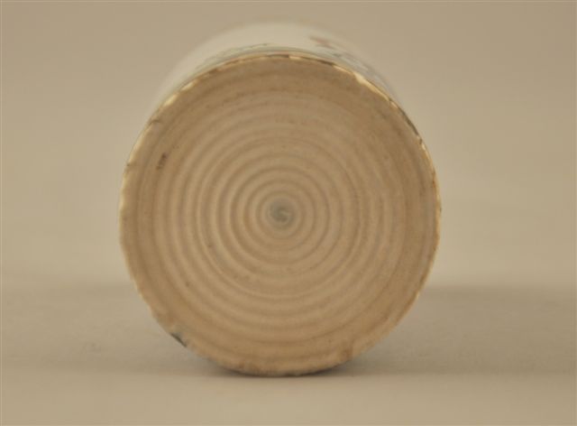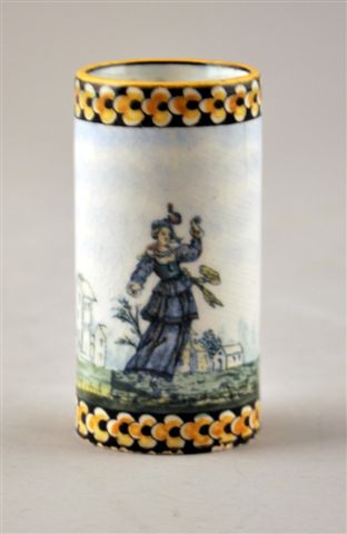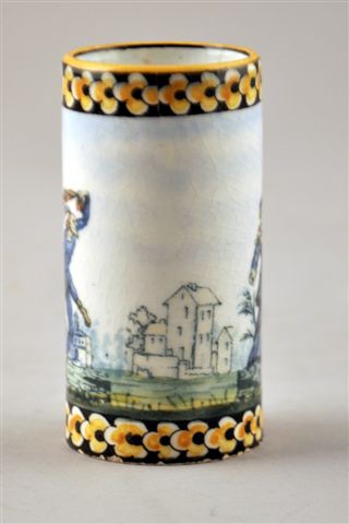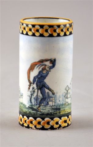 Petit VASE ROULEAU "CALLOT" en faïence, à décor imprimé rehaussé de couleur de deux personnages de la Commedia dell'Arte dans le goût de Jacques Callot. Une frise de raie de coeur sur fond noir en pied et au col. Fond annelé.