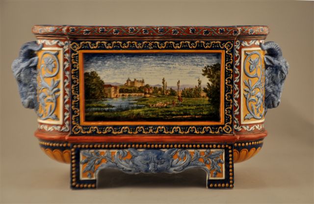 JARDINIÈRE PAR MAROIS en faïence moulée inspirée de Sèvres, prises à têtes de béliers et bases de façade à têtes de félins en camaïeu de bleu sur fond jaune agrémentés de feuilles de chênes et de rinceaux. Le décor est composé de deux grands panneaux peints par MAROIS représentant d'une part une scène de pâture auprès d'un pont à arches (Montargis?) et d'autre part une scène de pêche au pied d'une place forte. Contours ornés de frises de rinceaux ou de clous (en l'état: fêles de cuisson sous trois des pieds, petits éclats).