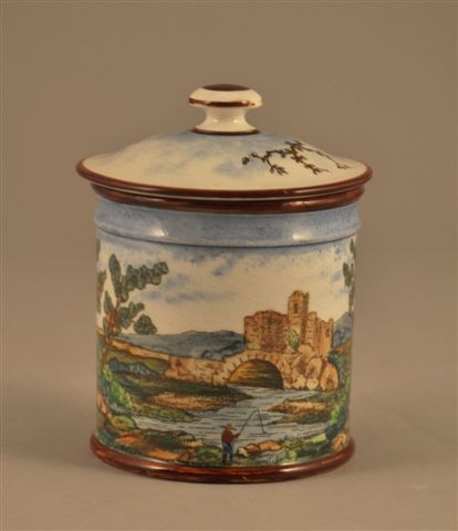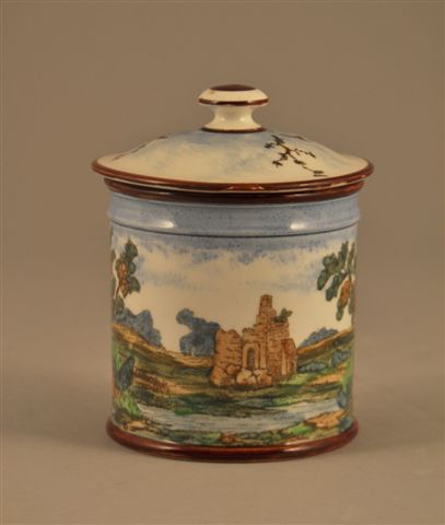 POT À TABAC ROND en faïence, à décor peint de pêcheur aux ruines attribuable à MAROIS (peintre de la manufacture spécialiste de paysages de ruines aux bords de rivières).