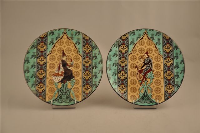 PAIRE DE PLATS RONDS "TROUBADOUR" en faïence, à décors imprimé en noir rehaussé de couleurs sous émaux colorés transparent d'un galant musicien depuis une assiette offrant une fleur à une dame au faucon dans l'autre assiette, sur un fond parsemé de médaillons quadrilobés sur fond marron clair. Des frises verticales de chardons stylisées encadrent les scènes (le plat féminin très accidenté).