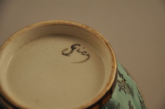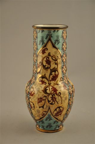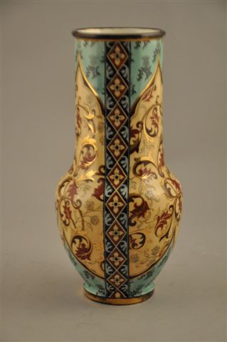 VASE À COL "MOYEN-ÂGE" en faïence, à décor "Moyen-Âge" de feuillages rehaussés d'or enroulés sur un léger fond d'oeillets ivoire alternant avec des bandes quadrillées en losanges avec fleurs et feuilles sur un fond noir et bordeaux. La base et le haut du col sont décorés de chardons sur fond vert d'eau (deux fêles intérieurs au col).