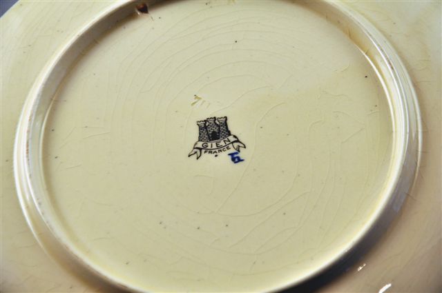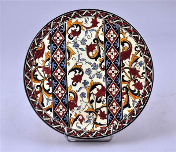 PLAT ROND NÉGOTHIQUE en faïence à bord uni, à décor polychrome de deux frises sur fond noir séparant le fond de feuillages et de fleurs dans le goût du Moyen-Âge. Fine frise géométrique sur l'aile.