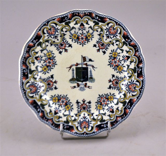 ASSIETTE HÉRALDIQUE "DE MARINE" en faïence à bord festonné, à décor polychrome d'un écu chiffré "CMG" orné d'une ancre de marine sur fond vert et bleu, surmonté d'un drapeau rouge, blanc et bleu, flanqué d'un phare à gauche et d'un vaisseau à droite, le tout agrémenté de deux devises: en haut "ATQUE PATIENTIA TEMPTUS" et en bas "TENAX". L'aile richement ornée de guirlandes fleuries dans le goût de Rouen.