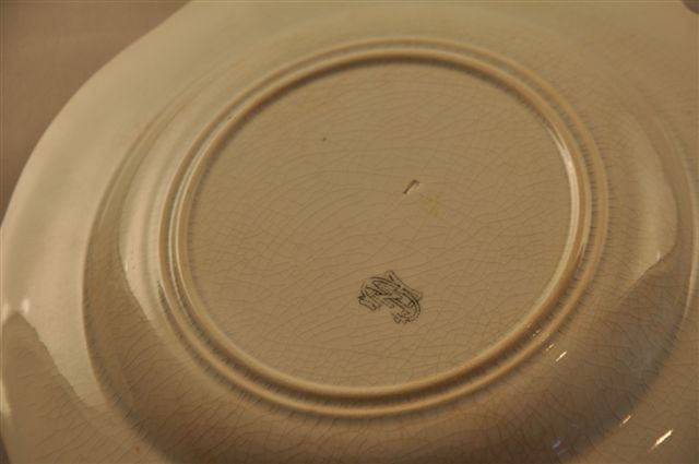 ASSIETTE HÉRALDIQUE "AUX VENDANGES" en faïence à bord festonné, à décor en impression de noir rehaussé de couleur: au centre d'une armoirie double à couronne de baron, supportée par une licorne de chaque côté, l'aile décorée d'une riche frise alternant enfants foulant les raisins dans un pressoir, chimères et vases, dans le goût de la Renaissance italienne.