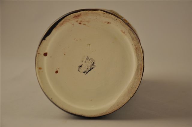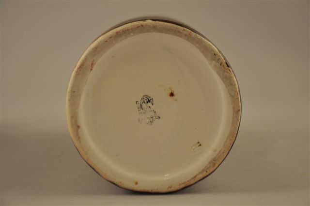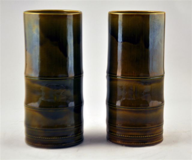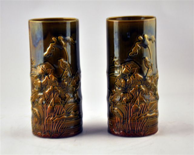 DEUX VASE ROULEAUX "VERT OLIVE" en faïence, à décor monochrome moulé dit vert olive d'oiseau, de montagnes, de lac et de nénuphars de couleur vert olive.