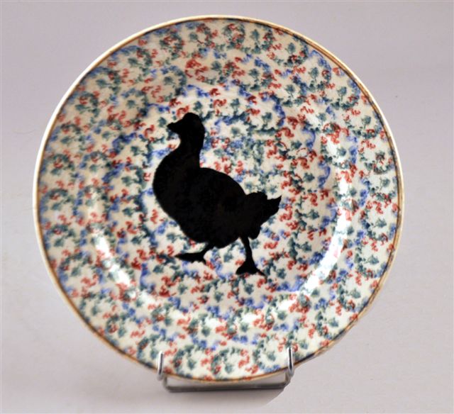 ASSIETTE À "L'OIE" en faïence à bord uni, à décor au pochoir représentant une oie en silhouette noir sur un fond cretonne bleu et rouge.