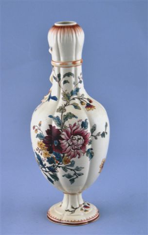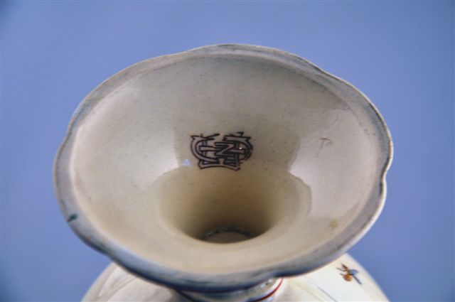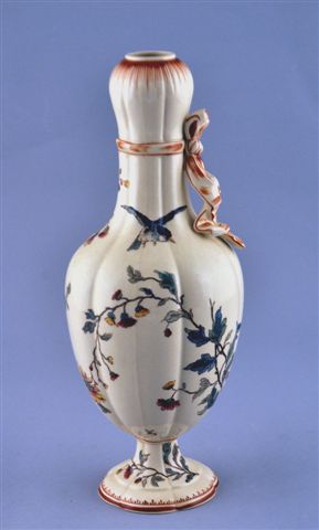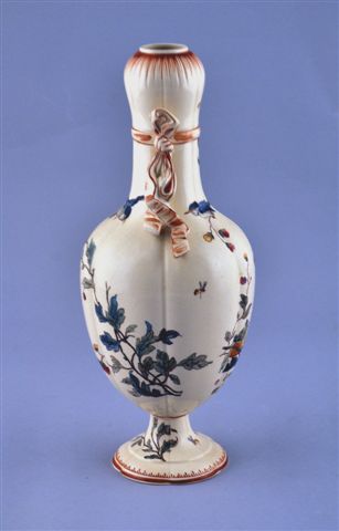 VASE COLOQUINTE en faïence avec un noeud en relief en trompe l'oeil sur le goulot. Décor floral imprimé en brun et rehaut de couleurs: branchages, feuillages et fleurs de chrysanthèmes polychromes, sur un fond ivoire. Des oiseaux et insectes complètent le décor.