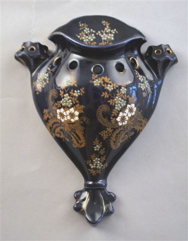 CORNET à suspendre de forme triangulaire en faïence, comportant de chaque côté de l'encolure un porte bougie. Décor de gouttes d'émail opaque blanc et turquoise agrémenté de feuillage à l'or sur fond bleu sombre (accidents, restaurations).