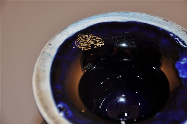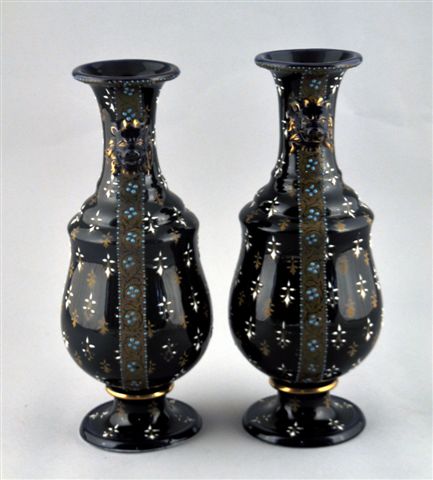 PAIRE DE VASES "CARAFES TÊTES DE LION" en faïence, à décor de gouttes d'émail opaque blanches formant des hermines sur fond bleu nuit et de rehauts d'or à motifs de rinceaux et d'hermines agrémentés de gouttes d'émail opaque turquoise (un petit éclat sur chaque piédouche).