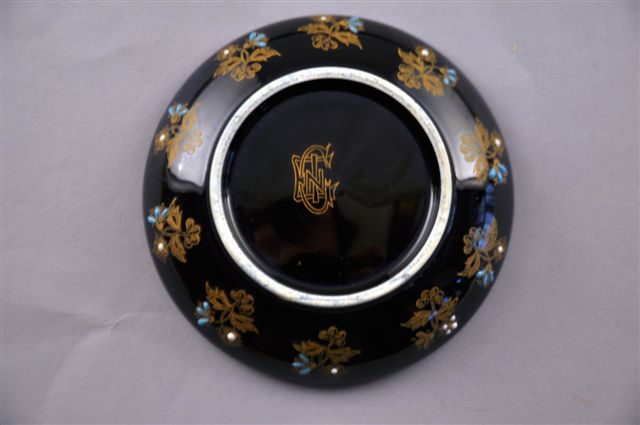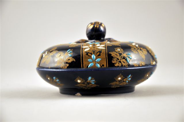 BONBONNIÈRE À LA POMME D'AMOUR en faïence, à décor floral de fins rehauts d'or et de gouttes d'émail blanc et turquoise sur fond bleu nuit. Prise du couvercle en pomme d'amour.