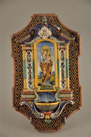 BÉNITIER ITALIEN surmonté d'une coquille en faïence, à décor de la Vierge à l'enfant dans une niche de temple encadrée de pilastres floraux, sur un fond cannelé semé de fleurs de lys (restauration).