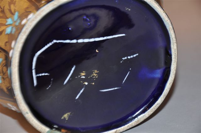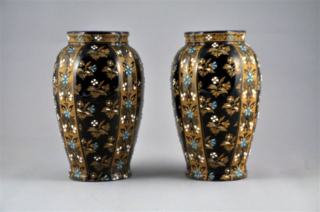 Paire de VASES GODRONNÉS À ÉPAULEMENT en faïence bleue nuit, décorés de frises et fleurs en rehauts d'or et goutte d'émail opaque blanche et turquoise (égrenure au col pour l'un et éclat au pied pour l'autre).