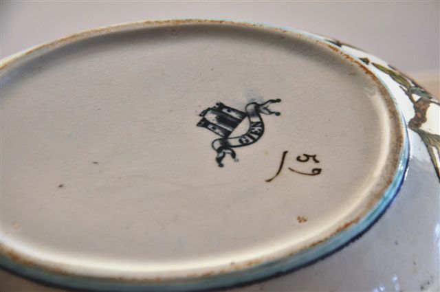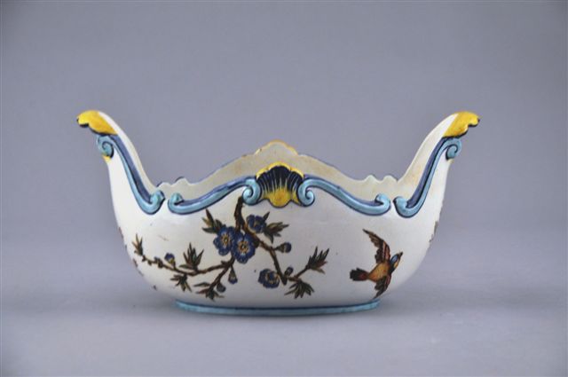 COUPE GONDOLE ROCAILLE en faïence, à décor polychrome floral se détachant sur fond blanc avec un oiseau volant vers un insecte, dans le goût du Japon. Liserés bleus, turquoise et rehauts jaunes.