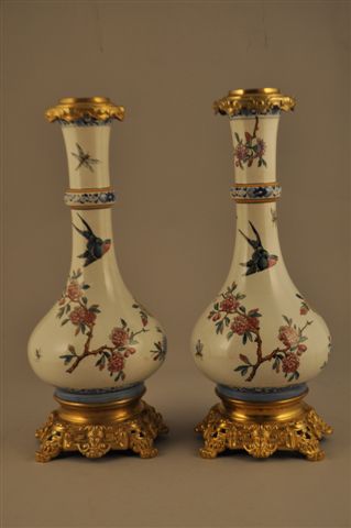 PAIRE DE LAMPES À HUILE "CHINOISES" en faïence, à décor d'oiseaux, de feuillages et d'insectes sur fond blanc dans le goût du Japon. Riche monture en bronze dans le style chinois.