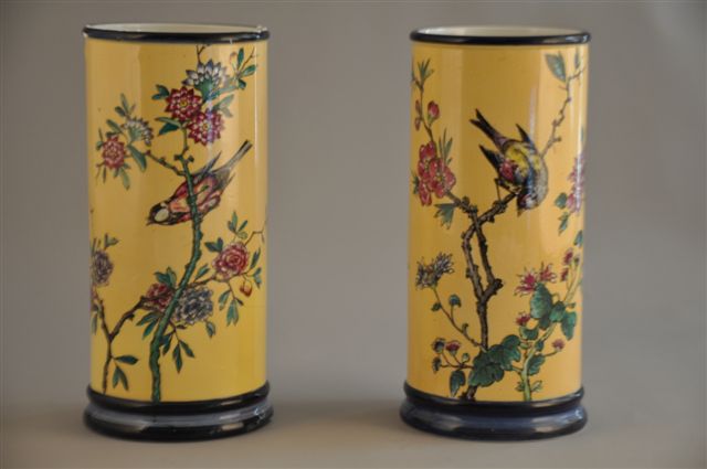 PAIRE DE VASES ROULEAUX en faïence, à décor de moineau perché sur des branchages fleuris dans le goût du Japon. Contour de col et de la base bleu nuit (un vase très accidenté).