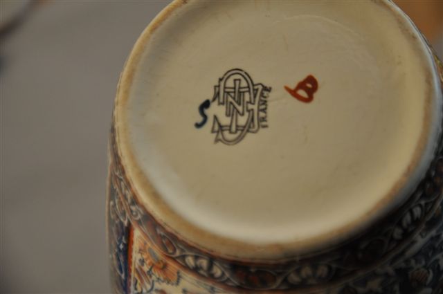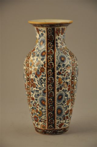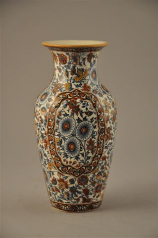 VASE BALLUSTRE "CACHEMIRE" en faïence, à décor floral aux tons chauds de grosses fleurs bleues dans un cartouche agrémenté de feuillages et de légères frises où s'harmonisent bleu, noir, jaune orangé et vert foncé dans le goût du Cachemire.