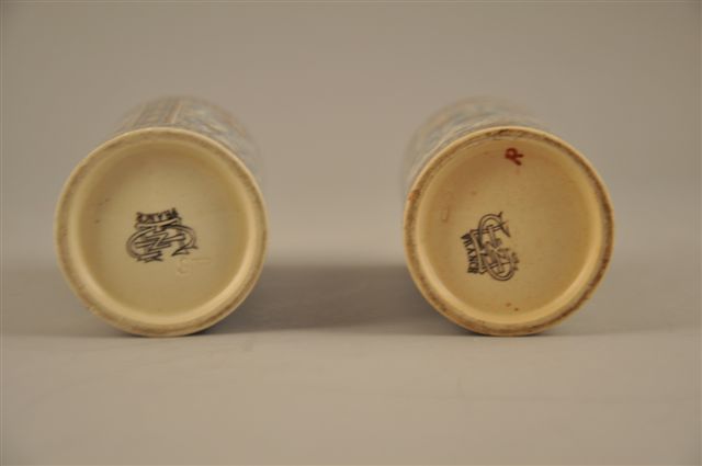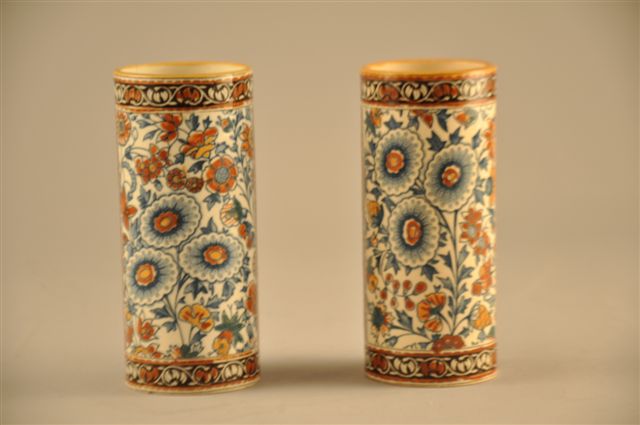PAIRE DE VASES ROULEAUX en faïence, à décor polychrome floral dans le goût du Cachemire, bordé de frises sur fond noir.
