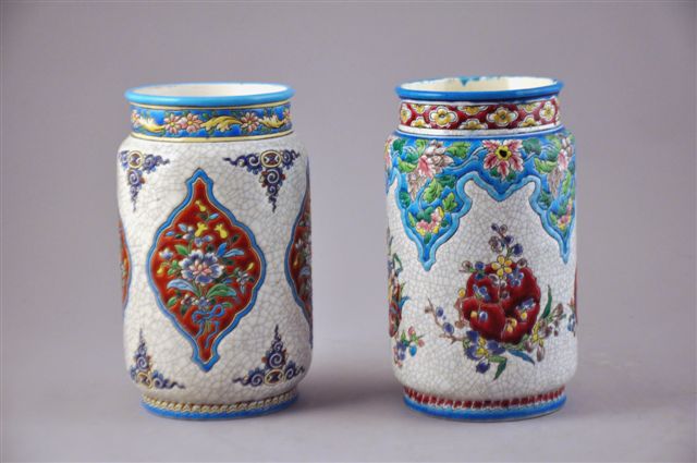 DEUX VASES rouleaux en faïence, à décor à l'émail craquelé de bouquets de fleurs sur fond blanc ou dans un cartouche prune sur fond blanc, réserve fleurie turquoise ou lambrequins stylisés, dans le goût de Longwy. Frise en pied et au col.