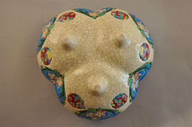 CACHE-POT TRILOBÉ en faïence, à décor polychrome sur fond craquelé blanc de six grands cartouches ronds composés de fleurs sur fond bleu et de douze petits cartouches ronds composés de fleurs sur fond grenat, dans le goût de Longwy. Une de vagues agrémente le col. L'intérieur ivoire.