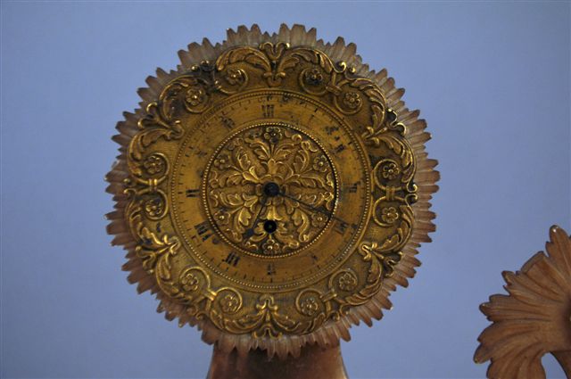 PENDULE en albâtre. Sur une base quadrangulaire reposant sur quatre pieds, de présentes deux piliers inégaux appliqués de motifs feuillagés. Cadran déporté en bronze orné de volutes feuillagées, sur entourage rayonnant.. Le second pilier présente un panier centré d'une fleur. Mouvement à coq signé Collier à Paris.