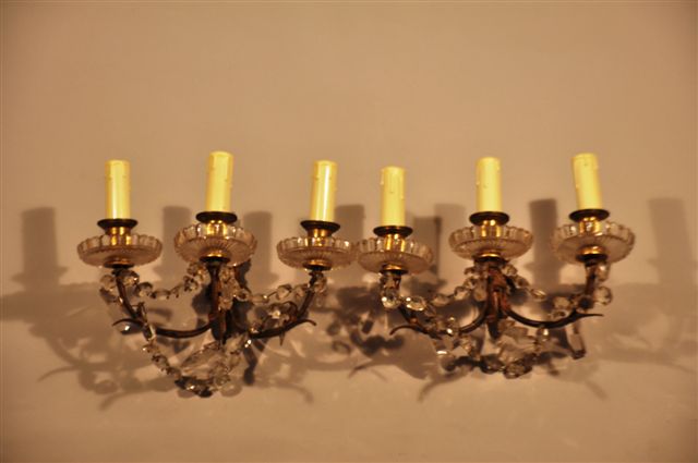 PAIRE d'APPLIQUES à trois bras de lumière en bronze, à pampilles.