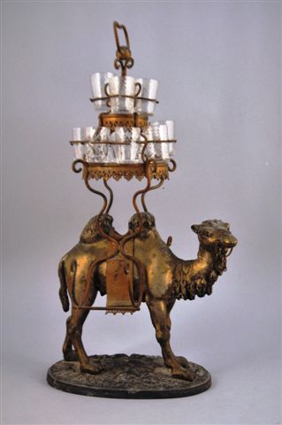 CAVE à liqueur "Chameau" en régule patiné. Un chameau sur terrasse ovale portant une structure porte-verres en laiton redoré. Comporte 12 gobelets en verre dont 6 à côtes torses et 6 "nid d'abeille".