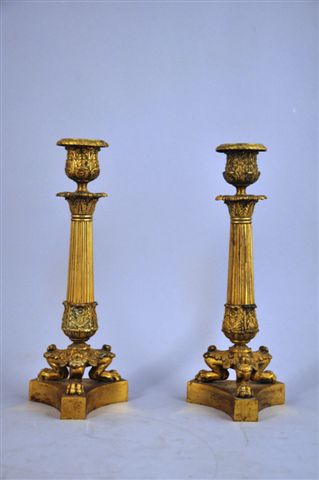 PAIRE de FLAMBEAUX en bronze doré. La base sur plinthe sur laquelle reposent trois pieds griffes, le fût à godrons verticaux orné à sa base et son sommet en chapiteau de feuilles en palmettes et fleurs stylisées. Binets feuillagés, bobèches à rangs de perles torses.