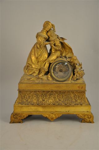 PENDULE en bronze doré à sujet romantique "Allégorie de la Consolation", représentant un couple. Elle repose sur quatre pieds à motifs de cornes d'abondance. Base quadrangulaire à gorge ornée d'une frise de larges palmettes et feuillage stylisé. Milieu du XIXème. Haut. 49, Larg. 41, Prof. 12,5 cm.