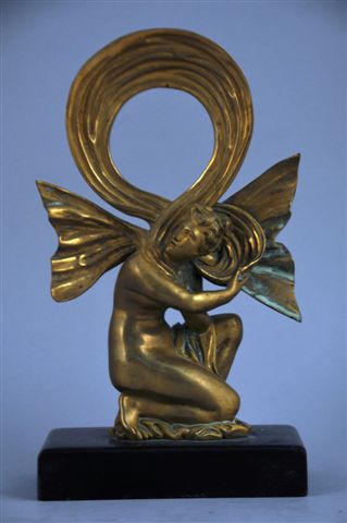 PORTE-MONTRE en bronze représentant une femme drapée agenouillée, à son écharpe. Socle rectangulaire en marbre noir.