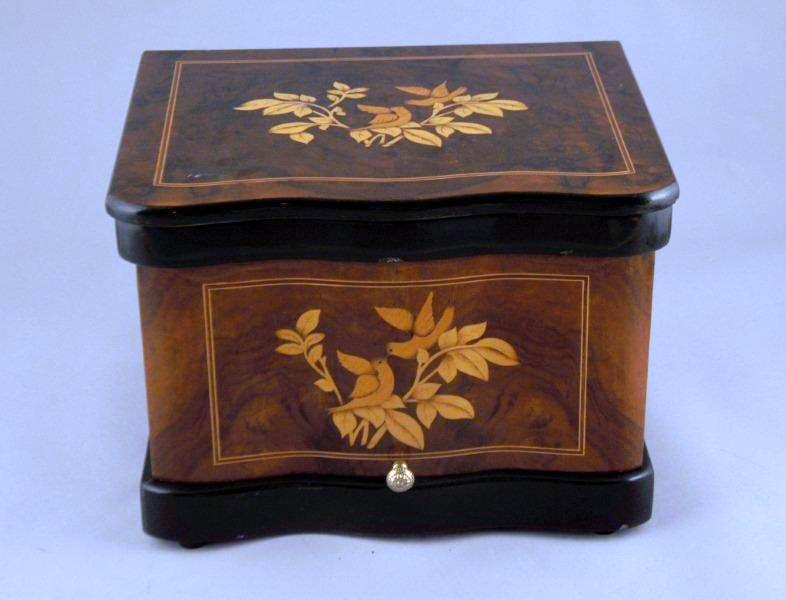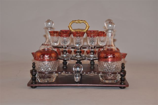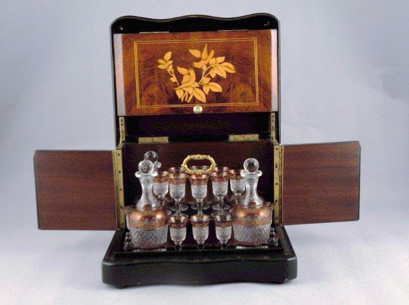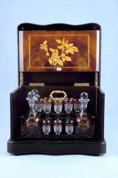 CAVE À LIQUEUR rectangulaire en merisier, poirier noirci et incrustations de citronnier ouvrant sur quatre faces, dont deux marquetées d'oiseaux branchés amoureux. Elle comprend trois carafes et leurs bouchons et onze verres en cristal taillé blanc et rose.