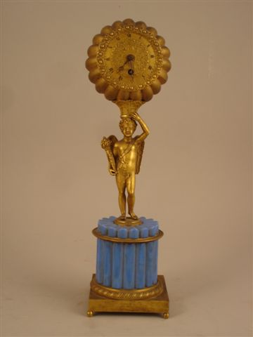 PENDULE en bronze doré et opaline bleue. La base quadrangulaire repose sur quatre pieds boule et présente une colonne à godrons verticaux en opaline bleue. Un angelot en "contra posto" tient de sa main gauche une corne d'abondance et porte au dessus de sa tête le cadran circulaire à décor floral.