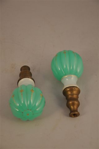 PAIRE de BOULES d'ESCALIER en opaline vert d'eau et blanc, de forme sphérique à côtes godronnées. Rehauts peints à l'or. Montée sur support en bronze (filetage).