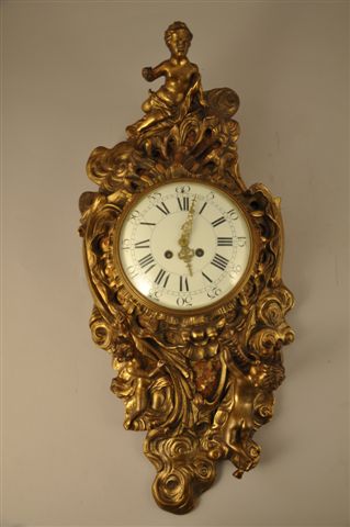 CARTEL d'applique en bronze doré, aux trois amours, dont l'un soufflant dans une conque. Cadran émaillé, chiffres romains, fines aiguilles au dauphin.