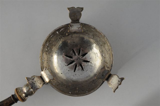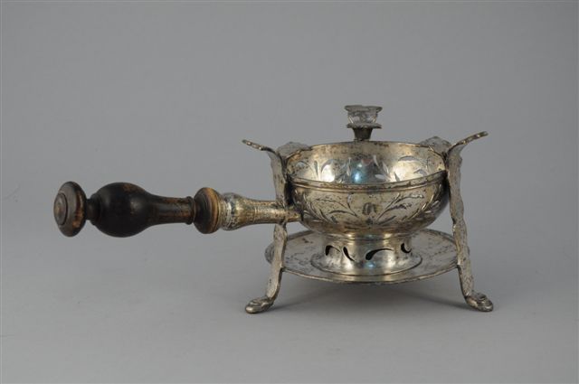 RÉCHAUD tripode en bronze argenté. Le foyer circulaire repercé de motifs de guirlandes. Manche en bois tourné noirci. XVIII-XIXème. Haut. 12, Long. 31, Larg. 15,5 cm.