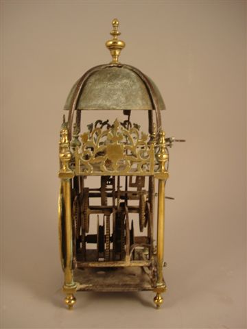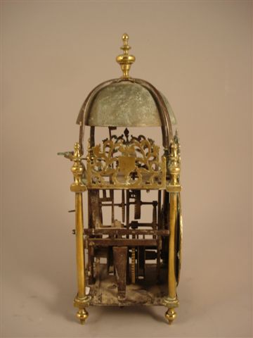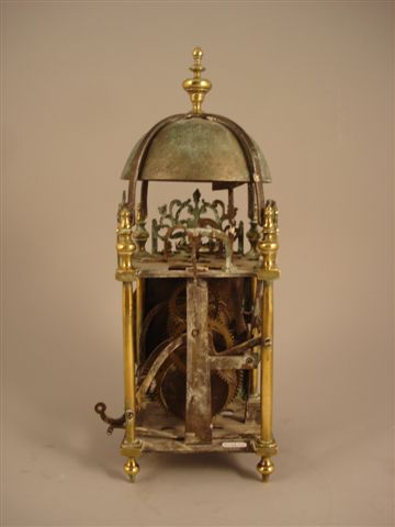 PENDULE dite "Lanterne" en fer, bronze et laiton. Echappement à verge et pendule. Style Louis XIV. Éléments XVIIème et postérieurs. Haut. 37, Larg. 14, Prof. 16 cm (incomplète)