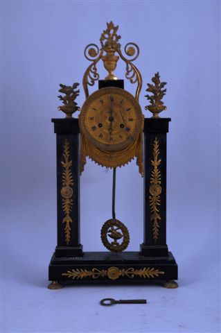 PENDULE portique en marbre noir. Elle repose sur quatre pieds patin. Ornementation de bronzes: motifs à rosaces et palmettes stylisées, trois vases fleuris au sommet. Cadran guilloché en laiton et bronze soutenu par un drapé. Mouvement à fil.