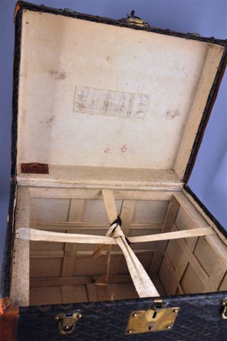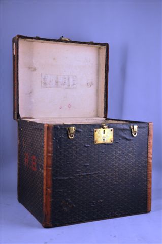MALLE garnie de toile enduite à chevrons. Angles renforcés de cuir fauve. Fermeture et cornières en laiton. poignée supérieur souple en cuir. Structure intérieure amovible. Monogramme latéral en rouge RB. E. GOYARD Ainé 233, rue St Honoré Paris. Marquée dans la toile, sur la serrure, sur une étiquette intérieure, sur deux étiquettes cloutées à l'extérieur.